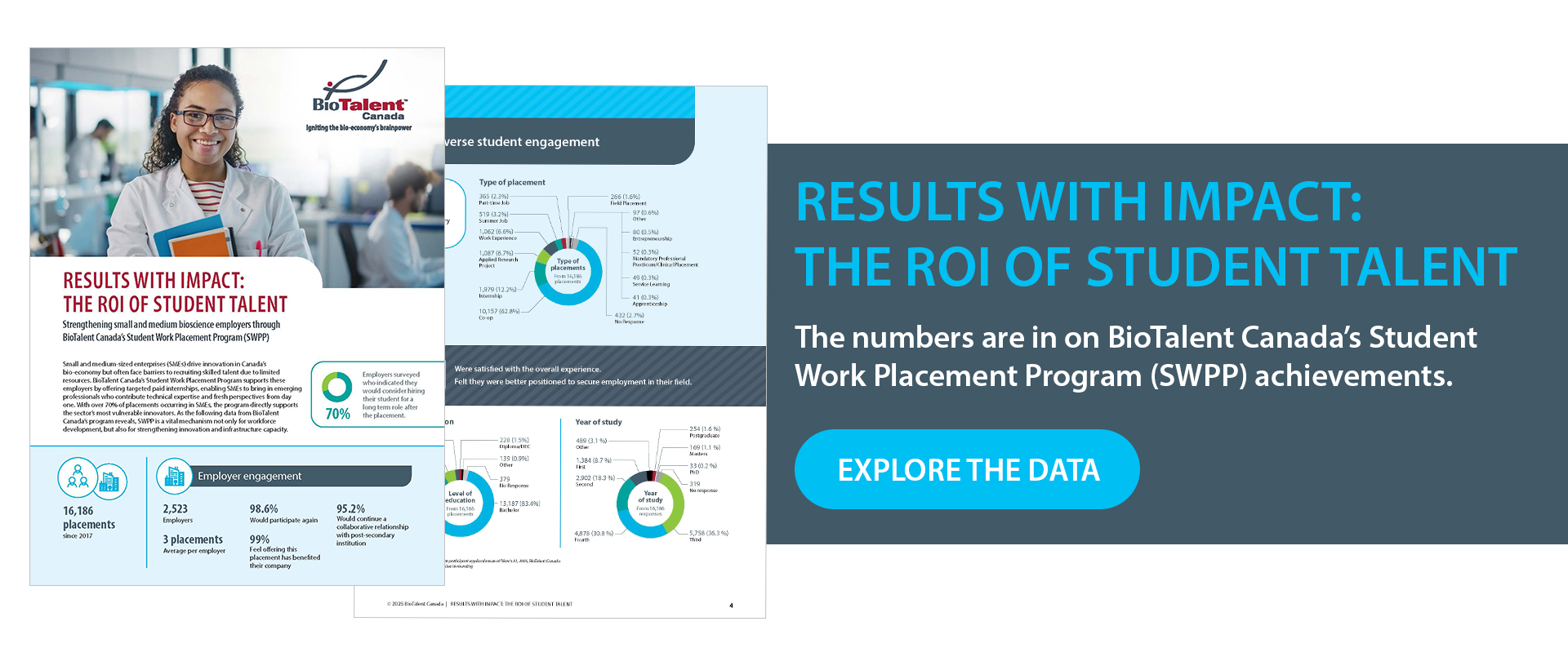 The report, Results with Impact: The ROI of Student Talent, underscores BioTalent Canada’s SWPP project’s role in building domestic talent pipelines through paid, hands-on work experiences that help students enter the workforce with relevant skills while giving Canadian businesses the capacity to grow.