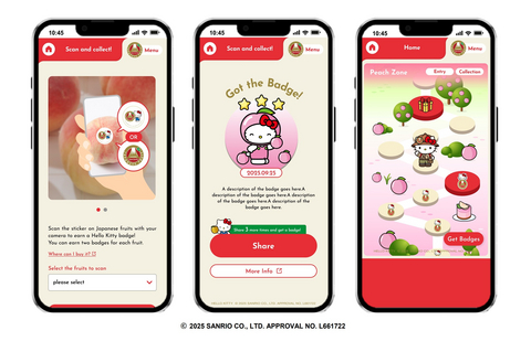 東京--(BUSINESS WIRE)--(美國商業資訊)-- 日本青果物輸出促進協議會(J-FEC)再次與三麗鷗株式會社及其人氣角色Hello Kitty合作,推出互動式數位活動「Hello Kitty日本水果狩獵」。參加者可使用智慧型手機探索各種實體地點,如餐廳、零售商店、宣傳活動等,尋找其展示的官方「日本產果實」標章2。只要用智慧型手機掃描該標章,就能收集數位徽章,並與Hello Kitty一起參加尋寶遊戲,以獨特的互動方式發現日本水果的新鮮與魅力。