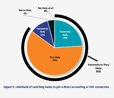 - Increased loyalty and service adoption: Nearly all finance leaders said a direct connection would increase their loyalty with 38% saying it would significantly increase the number of products used from the bank.