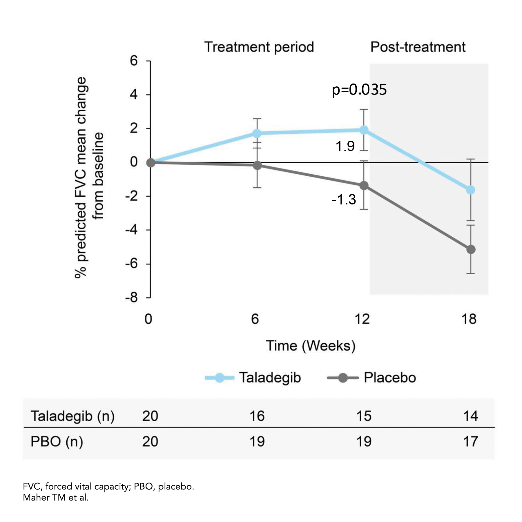 Patients who received taladegib experienced a statistically significant improvement in lung function assessed via spirometry through the 12 weeks of treatment.