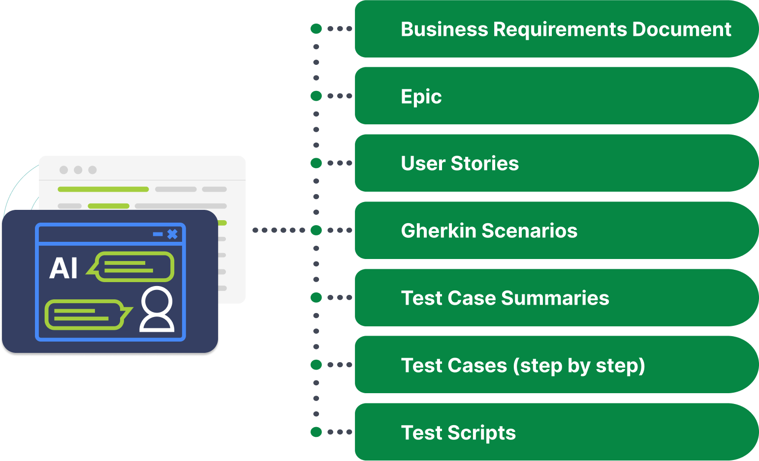 - Requirements to Execution – Input business requirements to generate epics, stories, scenarios, cases, and scripts.
