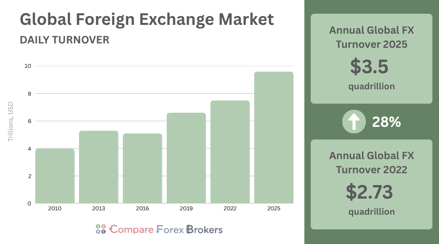 Ondanks de daling van 18,7% in de belangrijkste valutaparen is de totale activiteit aanzienlijk toegenomen, waarbij de dagelijkse omzet met 28% steeg tot 9,6 biljoen USD. Op jaarbasis komt dat neer op 3,5 biljard USD, een stijging ten opzichte van 2,73 biljard in 2022.