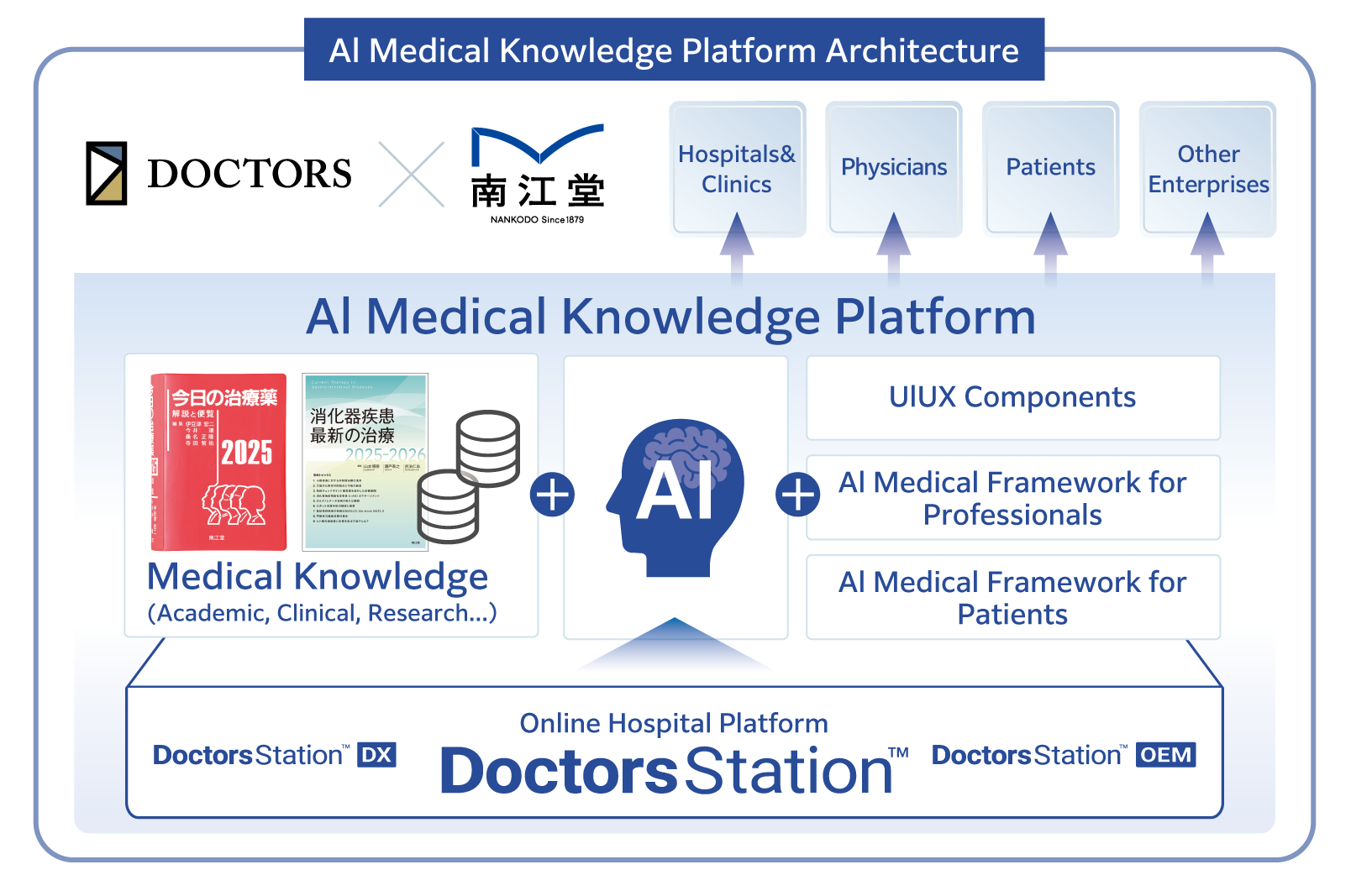 TOKYO--(BUSINESS WIRE)--Doctors, Inc. (Headquarters: Minato-ku, Tokyo; President & CEO: Takao Yanagawa; hereinafter “Doctors”), a leading provider of comprehensive digital health solutions ranging from service development to platform deployment, and Nankodo Co., Ltd. (Headquarters: Bunkyo-ku, Tokyo; President: Kenta Kodachi; hereinafter “Nankodo”), Japan’s foremost academic publisher specializing in medicine and healthcare, announced on September 30, 2025, the conclusion of a capital and business alliance agreement. Through this partnership, the two companies have commenced the joint development of a next-generation AI Medical Knowledge Platform, integrating Doctors’ digital health ecosystem—including the Doctors Station™ online medical support platform—with Nankodo’s extensive repository of medical publications and scholarly resources.