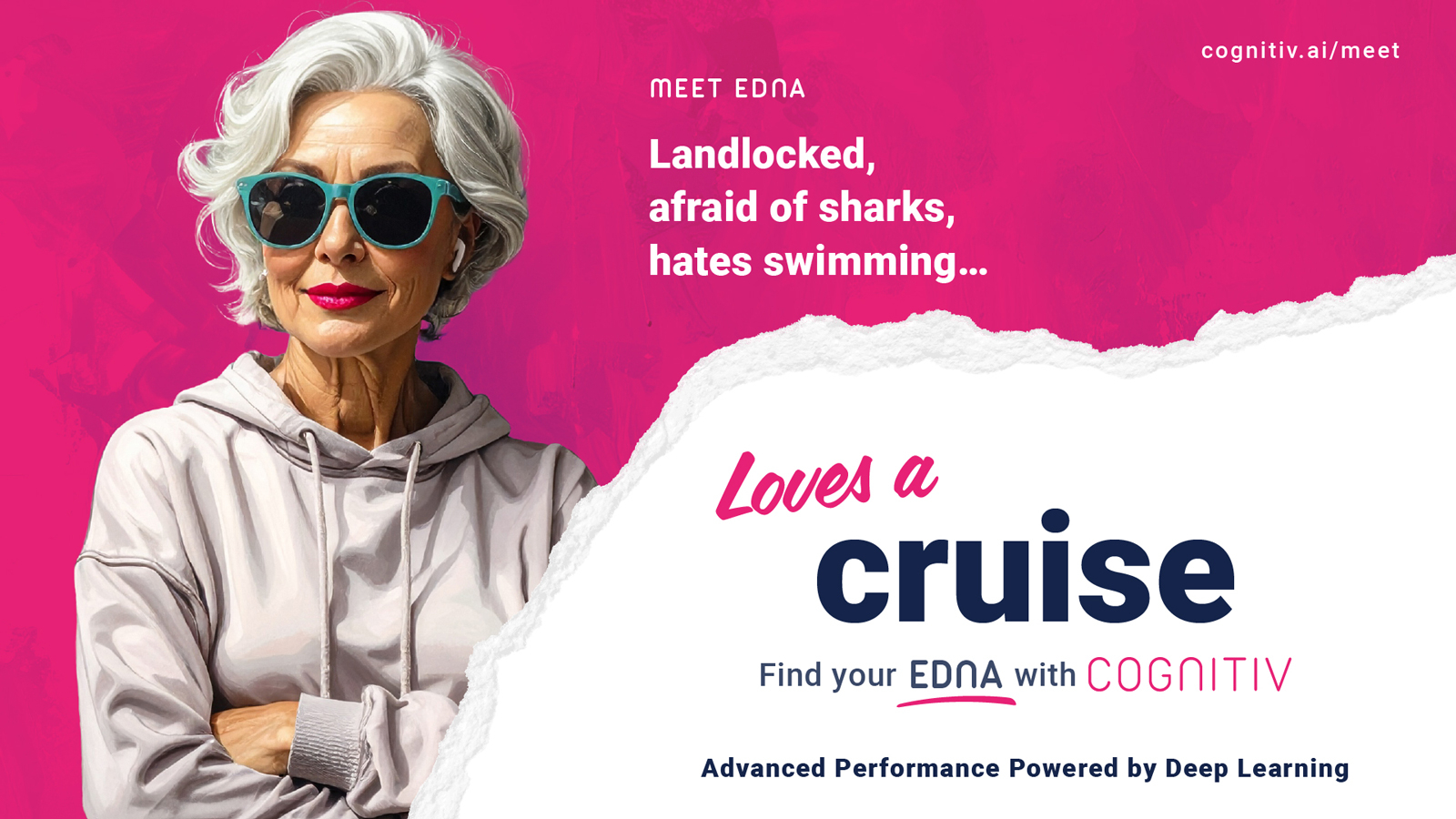Meet Edna – Cognitiv’s new brand campaign that flips targeting assumptions on their head. Edna is landlocked, afraid of sharks, and hates swimming… yet the surprising twist is that she loves cruises. Cognitiv’s Deep Learning Platform helps brands uncover unexpected insights into consumer behavior that drive better outcomes. Find your Edna! Unveiled at Advertising Week New York (Oct. 6, 2025). Image courtesy of Cognitiv.