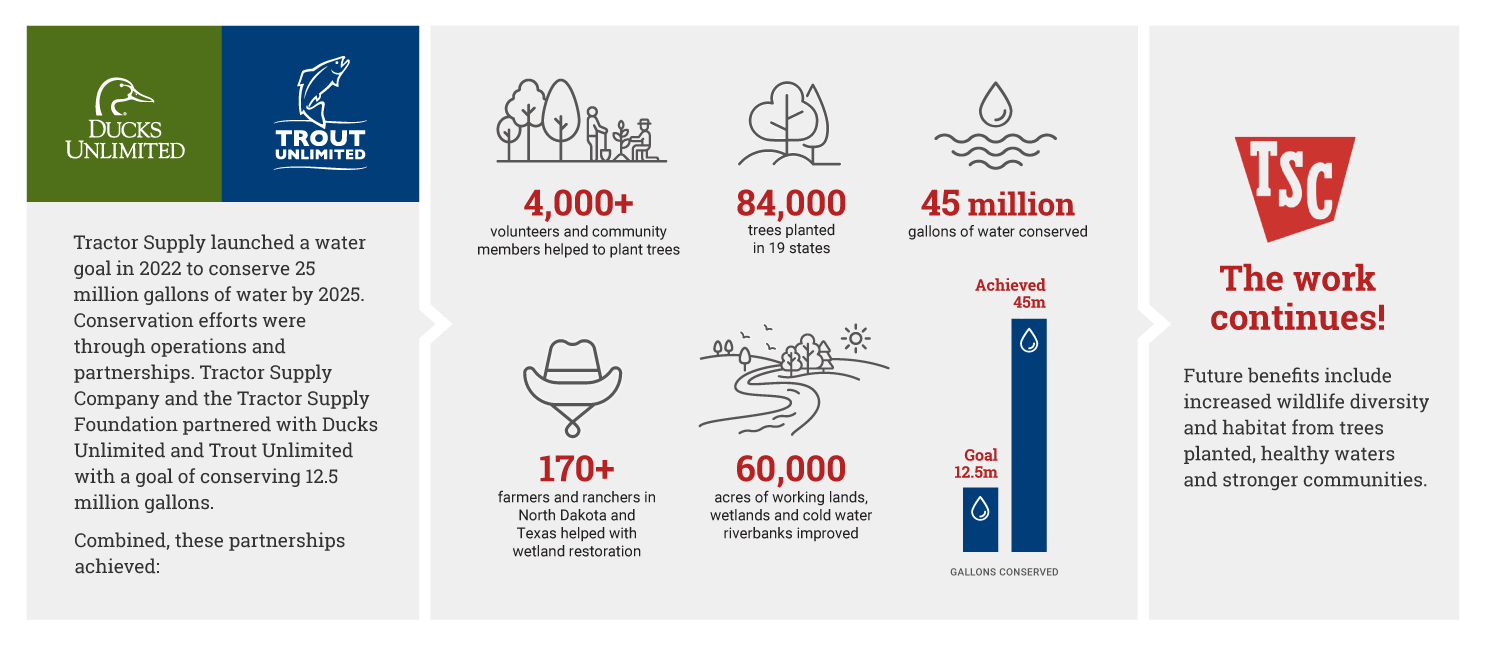 The Tractor Supply Company Foundation first partnered with the conservation groups in 2022 with a three-year investment into each organization. Goals included conserving 12.5 million gallons of water; planting trees to intercept stormwater runoff and sequester carbon dioxide; and enhancing working lands and wetlands. By the close of the partnership in spring 2025, the initiative had conserved 45 million gallons of water, planted 84,000 trees in 19 states and improved 60,000 acres of working lands, wetlands and cold-water riverbanks. The impact of these efforts includes increased wildlife diversity and habitat, healthy waters and stronger communities.