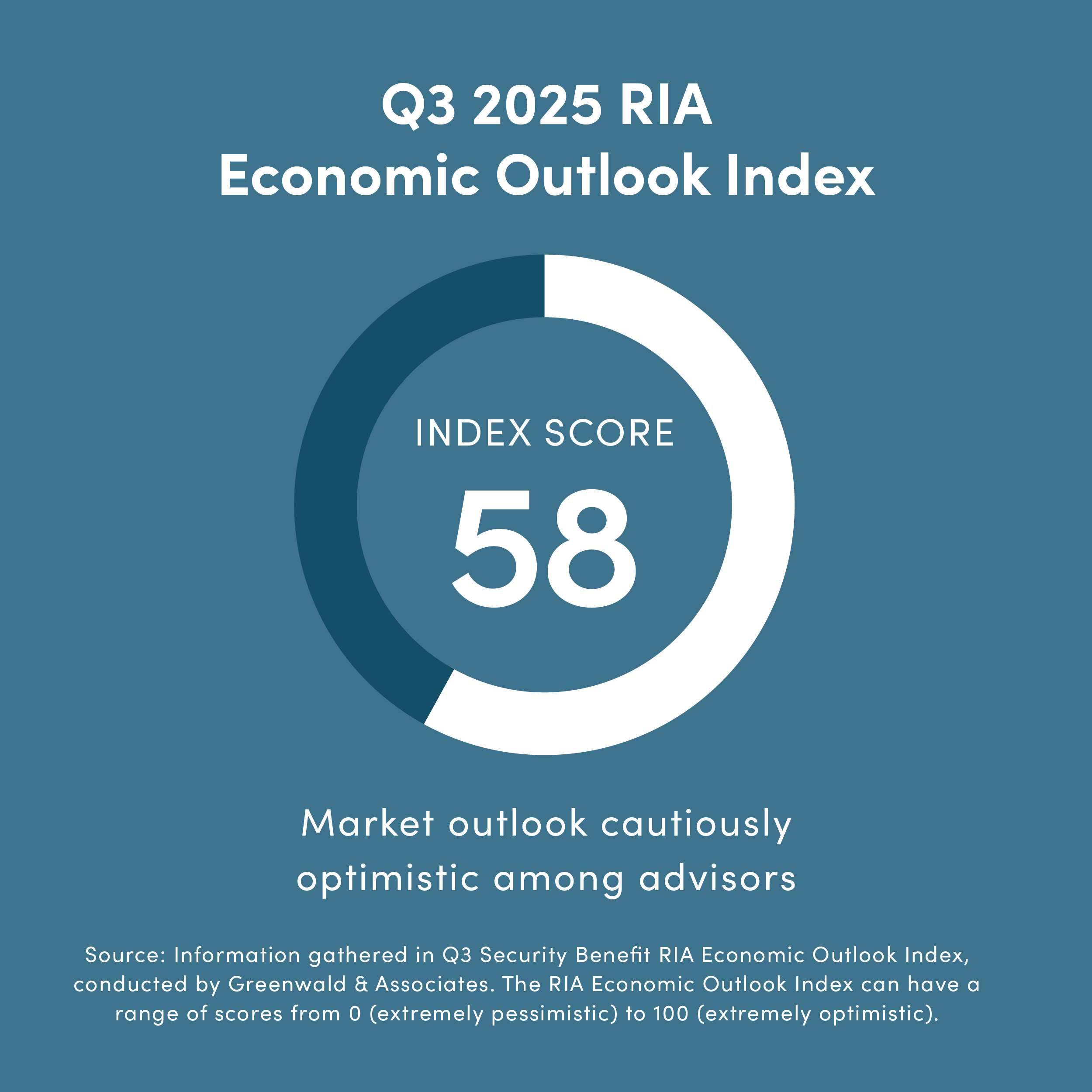 TOPEKA, Kan.--(BUSINESS WIRE)--Registered investment advisors (RIAs) remain cautiously optimistic about the economy, according to the latest RIA Economic Outlook Index released by Security Benefit in partnership with Greenwald Research. The Index, which measures RIA sentiment on a scale from 0 (extremely pessimistic) to 100 (extremely optimistic), fell slightly to 58 in Q3, down from 60 in Q2.
