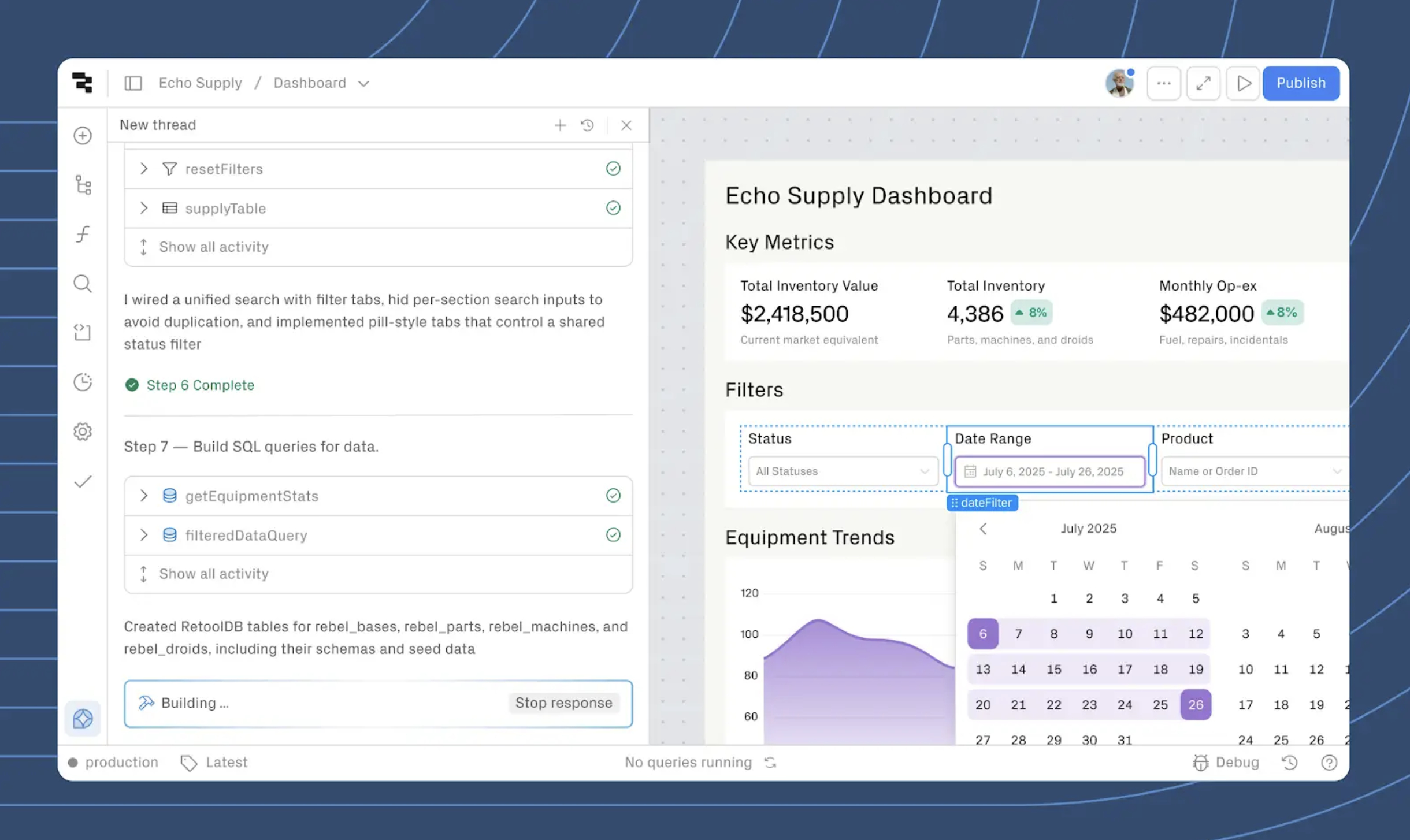 - Secure by default, built on what works: Automatically inherit enterprise security (SSO, RBAC, compliance) plus your team's trusted building blocks—proven queries, components, and workflows that already power your business