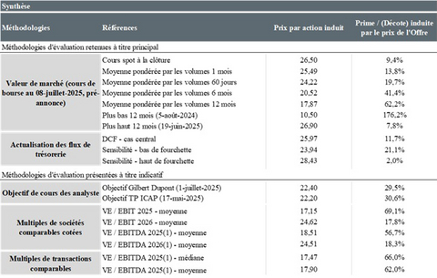 Le 28 août 2025, le Conseil d’administration de la Société a, sur recommandation du comité ad hoc, désigné le cabinet Crowe HAF, représenté par Messieurs Olivier Grivillers et Maxime Hazim, en qualité d’expert indépendant (l’« Expert Indépendant ») en charge d’établir un rapport sur le caractère équitable des conditions financières de l’Offre et de l’éventuel retrait obligatoire. La décision du Conseil d'administration de désigner le cabinet Crowe HAF en qualité d'Expert Indépendant a été annoncée dans un communiqué de presse publié par la Société le 28 août 2025.