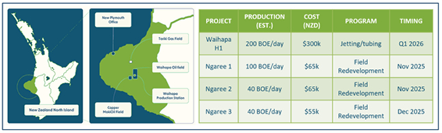 The steel casing in each well will be perforated at the target intervals, followed by production testing. All three wells are connected via existing pipelines to the Waihapa production and export facilities, allowing for immediate oil and gas sales upon successful completion. In the event of success, anticipated flow rates per well are expected to range from the tens to low hundreds of barrels of oil per day.