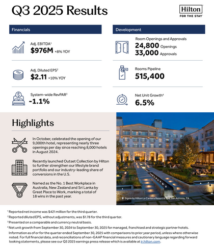 MCLEAN, Va.--(BUSINESS WIRE)--Hilton Worldwide Holdings Inc. ("Hilton," "the Company," "we," "us" or "our") (NYSE: HLT) today reported its third quarter 2025 results. Highlights include: