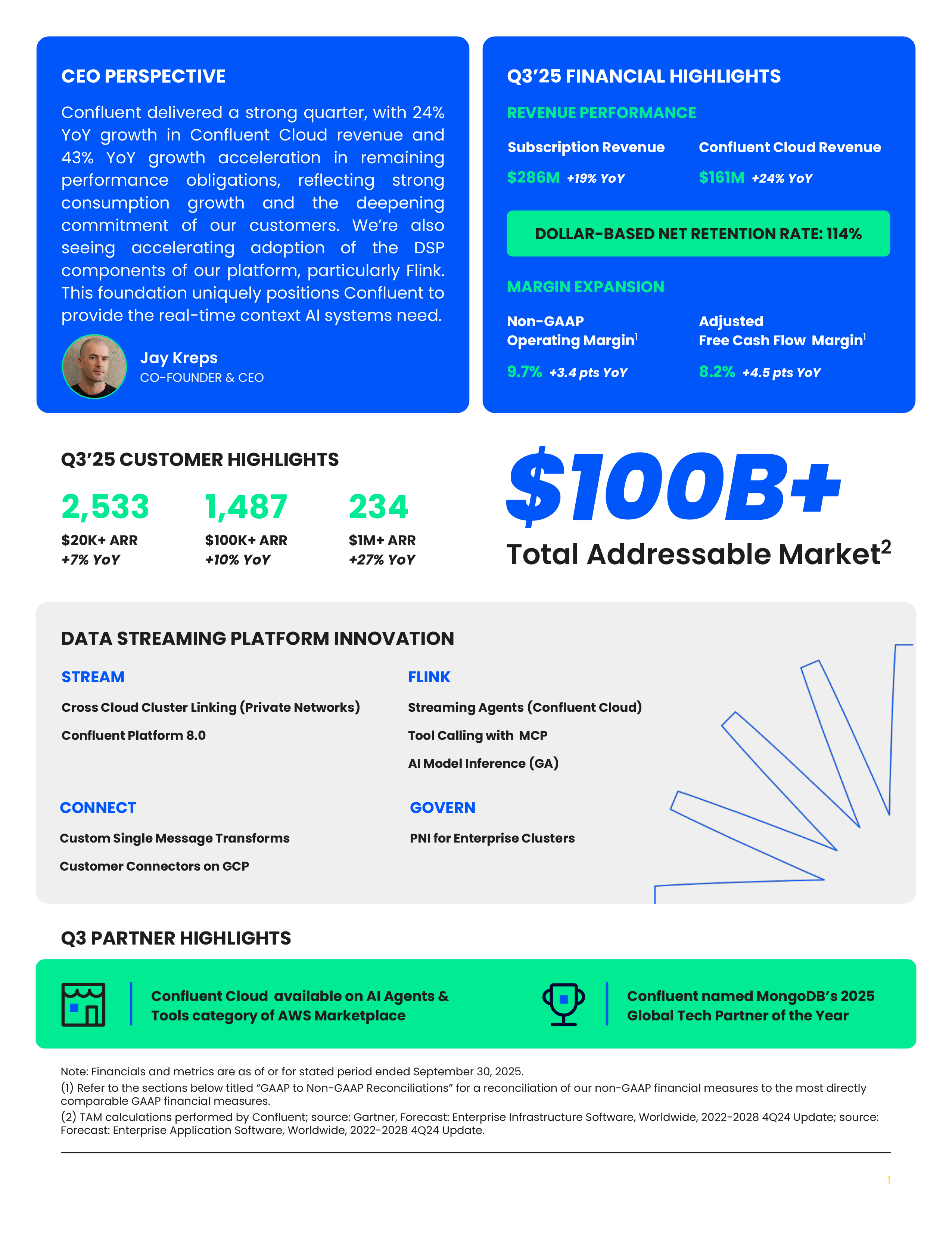 This press release and the earnings call referencing this press release contain forward-looking statements including, among other things, statements regarding (i) our financial outlook, including expected subscription revenue, Confluent Cloud revenue, non-GAAP operating margin, free cash flow margin, adjusted free cash flow margin, non-GAAP net income per share, revenue mix, revenue run rates, Confluent Cloud and data streaming platform growth, adoption and traction, operating margins and margin improvements, targeted or anticipated gross and operating margin levels, earnings per share levels and improvements, in-product optimizations of Confluent Cloud, continued business momentum, and expected revenue, (ii) our market and category leadership position, (iii) our expectations and trends relating to growth of our Data Streaming Platform products, (iv) rates of Confluent Cloud consumption, Confluent Platform growth, and demand for and retention of data streaming platforms like Confluent, (v) customer growth, retention and engagement, and expansion of customers into new use cases, (vi) increased adoption of our offerings and fully managed solutions for data streaming in general, including from customers building generative AI applications, (vii) our expectations regarding the impact of operational improvements, including our sales and go-to-market strategies, (viii) growth in and growth rate of revenue, customers, dollar-based net retention rate, and gross retention rate, (ix) our ability to increase engagement of customers for Confluent and expand customer cohorts, (x) our market opportunity and our ability to capture our market opportunity, (xi) our go-to-market strategy, (xii) our product differentiation and market acceptance of our products, (xiii) our strategy and expected results and market acceptance for our offerings, (xiv) our expectations of meeting near-term and mid-term financial targets, (xv) our expectations regarding the generative AI landscape and our offerings, (xvi) our ability to drive long-term growth, (xvii) our expectations regarding the impact of our offerings, including WarpStream and Freight Clusters, (xviii) our expectations regarding our growth strategies and our partner ecosystem, and (xix) our overall future prospects. The words “believe,” “may,” “will,” “estimate,” “continue,” “anticipate,” “intend,” “expect,” “seek,” “plan,” “project,” “target,” “looking ahead,” “look to,” “move into,” and similar expressions are intended to identify forward-looking statements. Forward-looking statements represent our current beliefs, estimates and assumptions only as of the date of this press release and information contained in this press release should not be relied upon as representing our estimates as of any subsequent date. These forward-looking statements are subject to risks, uncertainties, and assumptions. If the risks materialize or assumptions prove incorrect, actual results could differ materially from the results implied by these forward-looking statements. Risks include, but are not limited to: (i) our limited operating history, including in uncertain macroeconomic environments, (ii) our ability to sustain and manage our rapid growth, (iii) our ability to increase consumption of our offerings, including by existing customers and through the acquisition of new customers, including by addressing customer consumption preferences, successfully adding new features and functionality to our offerings, and partnering with our customers to help them realize increased value in Confluent in an efficient and sustainable manner, (iv) our ability to successfully execute our go-to-market strategy and initiatives, (v) our ability to attract new customers and successfully ramp their consumption of our offerings, as well as retain and sell additional features and services to our existing customers, (vi) uncertain macroeconomic conditions, including high inflation, high interest rates, bank failures, global tariffs, taxes on multinational companies, geopolitical events, recessionary risks, and exchange rate fluctuations, (vii) the estimated addressable market opportunity for our Data Streaming Platform, and our ability to capture our share of that market opportunity, (viii) shifts in certain customers’ data streaming strategies, (ix) our ability to compete effectively in an increasingly competitive market, (x) our ability to attract, ramp, and retain highly qualified personnel, and the impacts of attrition and related challenges, (xi) breaches in our security measures, intentional or accidental cybersecurity incidents or unauthorized access to our platform, our data, or our customers’ or other users’ personal data, (xii) our reliance on third-party cloud-based infrastructure to host Confluent Cloud, (xiii) public sector budgetary cycles and funding reductions or delays, or shifts in procurement strategies, (xiv) changes in legislation related to the taxation of business entities, and (xv) our ability to accurately forecast our future performance, business and growth. These risks are not exhaustive. Further information on these and other risks that could affect Confluent’s results is included in our filings with the Securities and Exchange Commission (“SEC”), including our Quarterly Report on Form 10-Q for the quarter ended June 30, 2025, and our future reports that we may file from time to time with the SEC. Additional information will be made available in our Quarterly Report on Form 10-Q for the quarter ended September 30, 2025 that will be filed with the SEC, which should be read in conjunction with this press release and the financial results included herein. Confluent assumes no obligation to, and does not currently intend to, update or revise any forward-looking statements, whether as a result of new information, future events or otherwise, except as required by law.