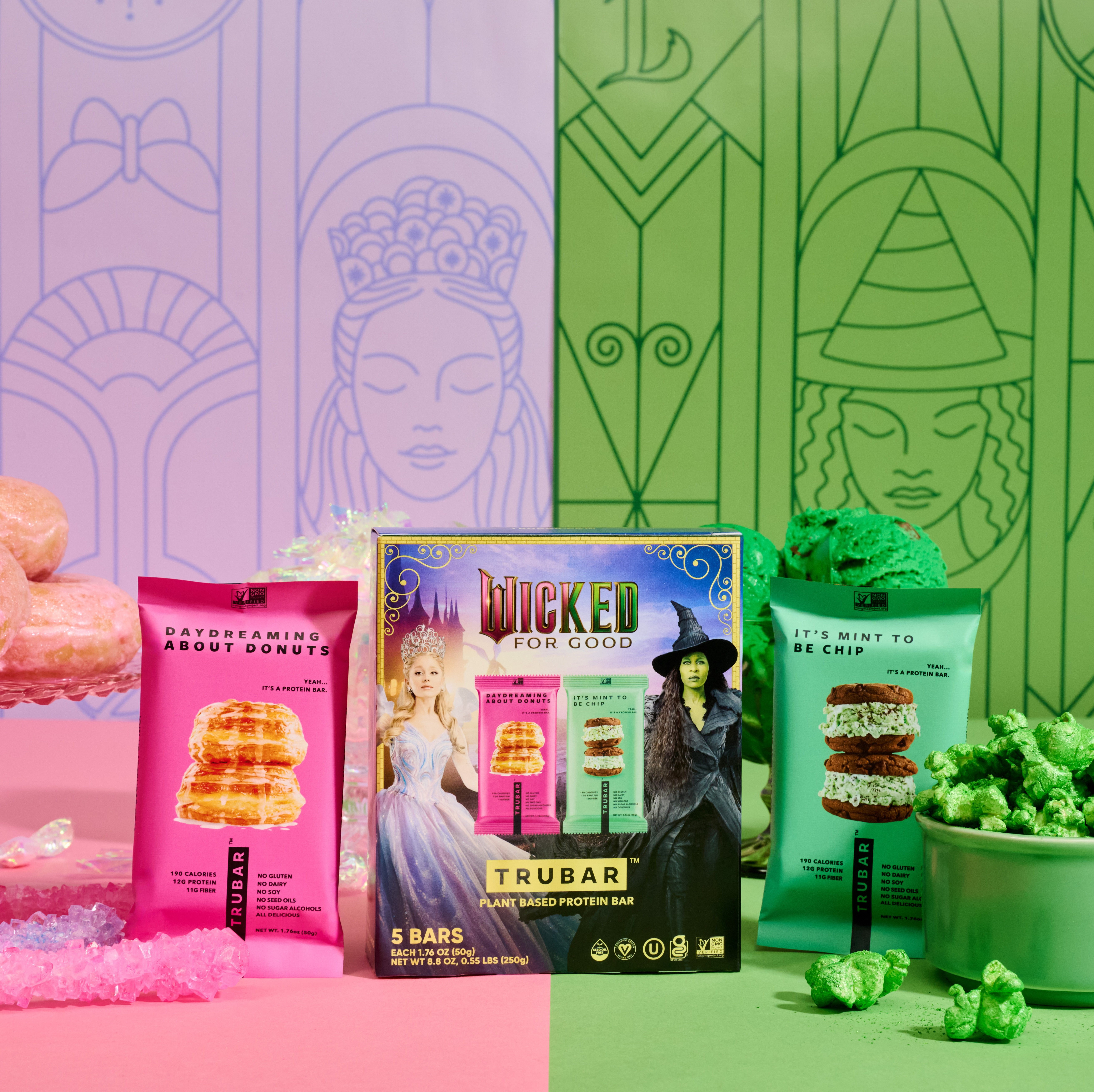 Available now on TRUBAR’S website and in more than 3,900 stores on November 1 at Target, Albertsons, and Safeway, the five-bar limited-edition box brings a touch of magic to snack time. Each set features fan-favorites: It’s Mint to Be Chip (green), a tribute to Elphaba’s bold journey of defying expectations, and Daydreaming About Donuts (pink), a playful nod to Glinda’s dream of being adored. Together, they capture the heart of Wicked: For Good, where friendship and empowerment intertwine.