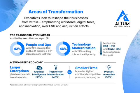 NEW YORK--(BUSINESS WIRE)--Today, Altum Strategy Group, in partnership with YouGov, launched its annual NextWave Survey results, which captures sentiment from over 500 senior executives across industries. For 2026, business leaders are entering with sharply divided expectations for the economy, and for the first time since 2020, optimism and pessimism are nearly even — with 41 percent of leaders optimistic about the year ahead and 42 percent pessimistic — signaling a dramatic cooling from last year’s confidence rebound.