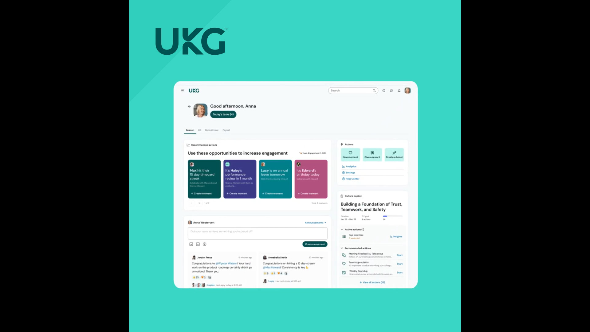 - Predictive engagement nudges: The combination of scheduling data and sentiment analysis allows UKG Beacon to proactively suggest actions and activities for employees.