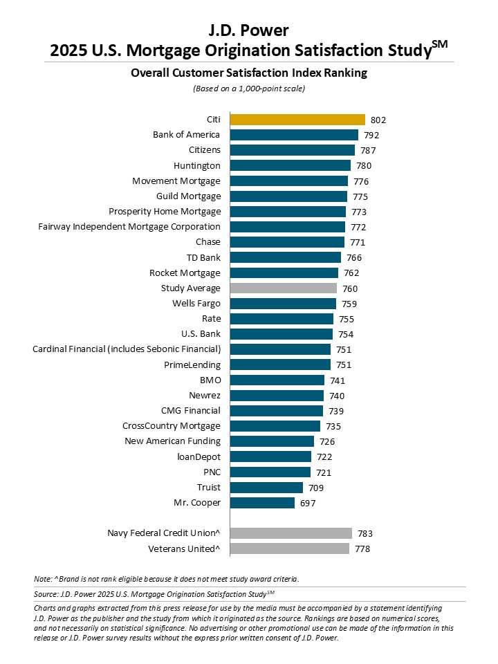 Citi ranks highest in mortgage origination satisfaction, with a score of 802. Bank of America (792) ranks second and Citizens (787) ranks third.