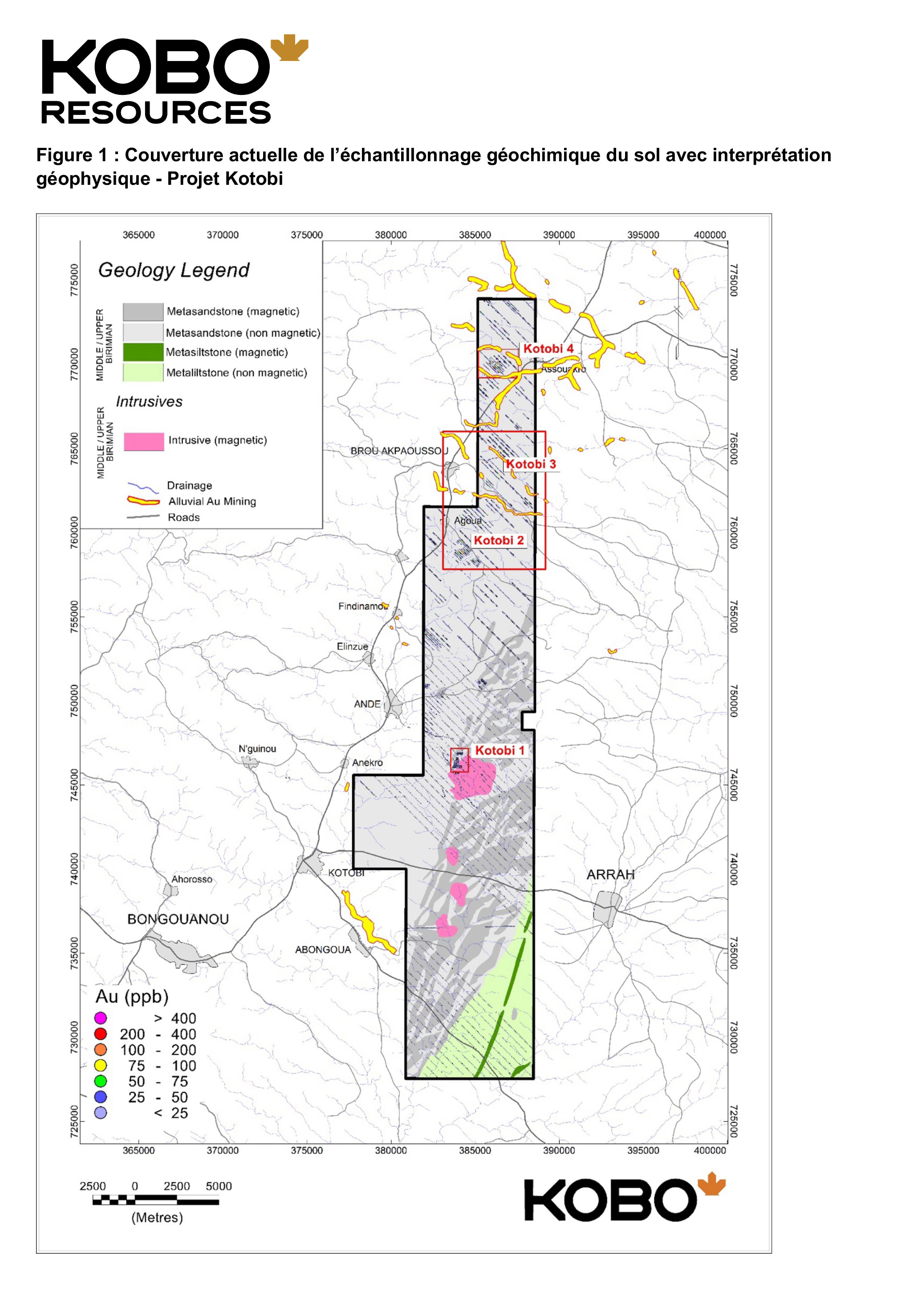 La géochimie du sol réalisée à ce jour a permis de définir quatre cibles aurifères fortement anomales (appelées Kotobi 1, Kotobi 2, Kotobi 3 et Kotobi 4). L’emplacement des cibles individuelles est indiqué dans la figure 1.