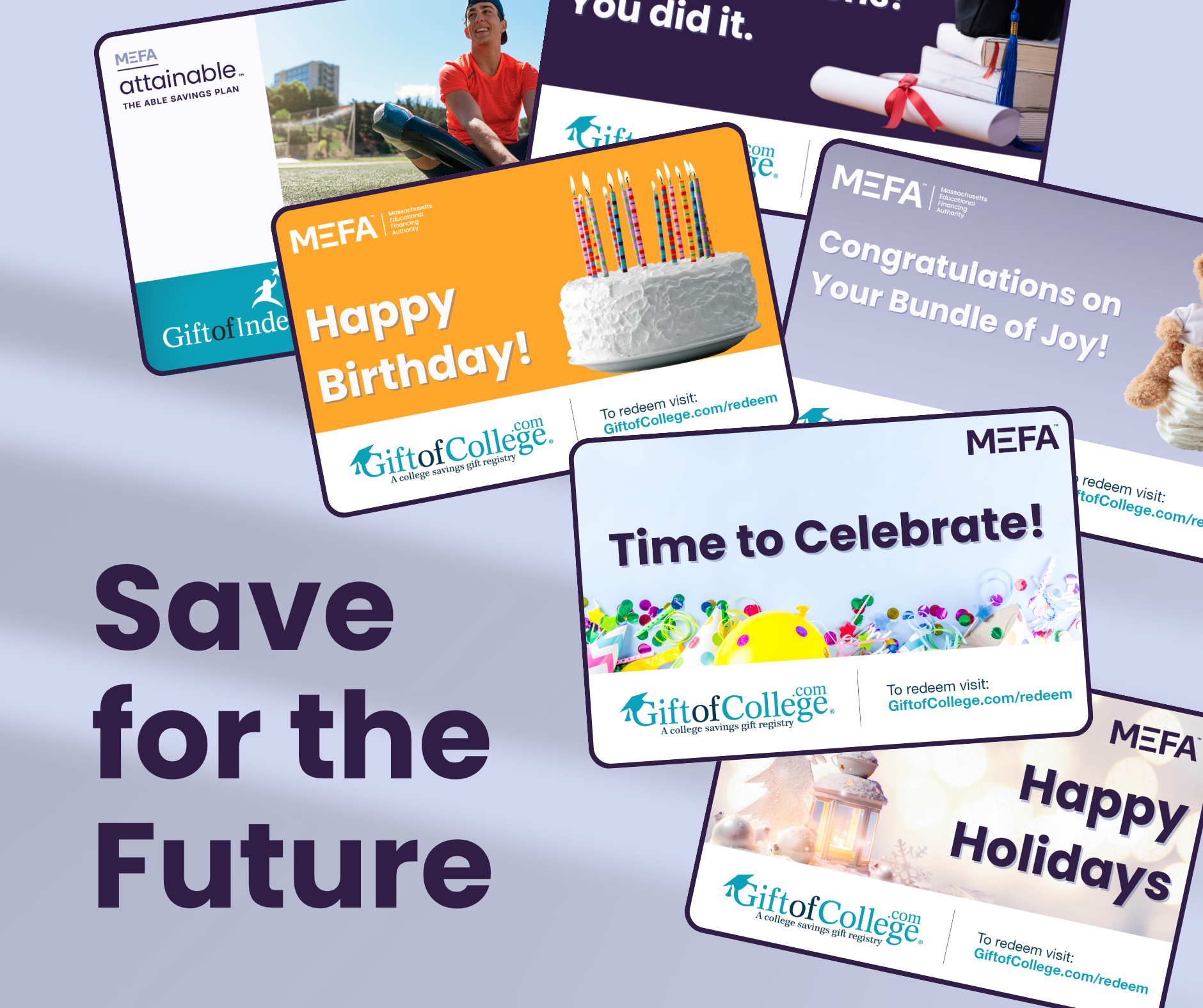Also new for this holiday season, the MEFA Gift of College Card is more widely available at popular retailers across the Commonwealth, including CVS, Cumberland Farms, and Stop and Shop. Launched last year, the MEFA Gift of College Card enables the recipient to quickly and easily transfer the card’s cash value toward a MEFA college savings account or student loan balance.