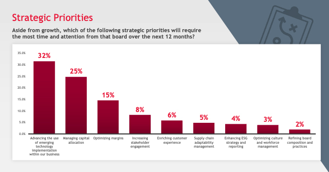 In addition to capturing board sentiment on economic uncertainty, regulatory change, and technological disruption, the survey also revealed insight into how directors will approach growth, risk, and human capital considerations of the board, management, and the broader workforce over the next 12 months: