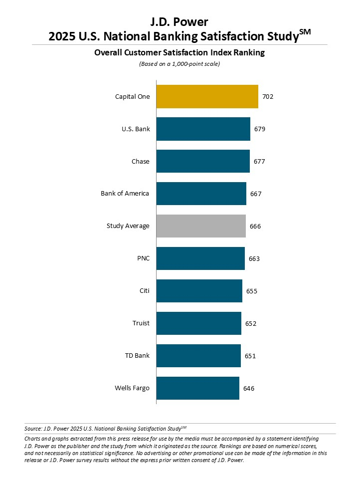 Capital One ranks highest in overall satisfaction for a sixth consecutive year, with a score of 702. U.S. Bank (679) ranks second and Chase (677) ranks third.