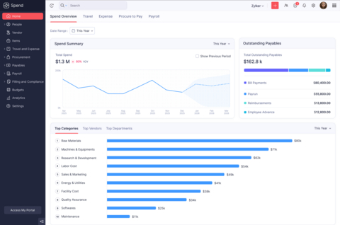Zoho Spend is an industry-first, all-in-one solution to manage procurement, AP automation, corporate travel, employee expenses, and payroll. With a comprehensive dashboard, the software provides a consolidated view into each of these critical areas, allowing finance leaders to take control of their budgets, strengthen governance, and curb maverick spend, converting spend management into a strategic advantage.