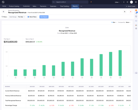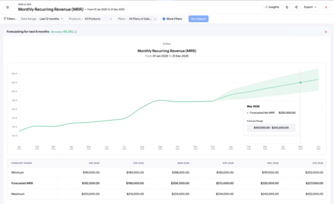 Additionally, businesses benefit from AI features inside of the Billing platform. Ask Zia serves as a Finance Assistant, helping the user with actionable insights on critical areas like billing efficiency, customer behavior, and overall business performance with a range of prompts. Zia Insights helps businesses gain a deeper understanding of key reports by identifying anomalies, tracking trends, and forecasting future performance. Finance leaders can leverage the AI-based revenue forecasting capability to identify risks and opportunities to make timely and strategic business decisions.
