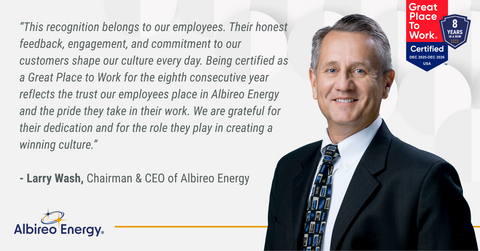 "Being certified as a Great Place to Work for the eighth consecutive year reflects the trust our employees place in Albireo Energy and the pride they take in their work." - Larry Wash, Chairman and CEO of Albireo Energy