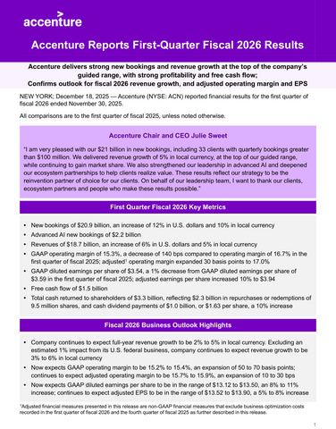 Accenture will host a conference call at 8:00 a.m. EST today to discuss its first quarter fiscal 2026 financial results. To participate in the teleconference, please dial +1 (877) 883-0383 [+1 (412) 317-6061 outside the U.S., Puerto Rico and Canada] and enter access code 1422495 approximately 15 minutes before the scheduled start of the call. The conference call will also be accessible live via webcast on the Investor Relations section of the Accenture website at accenture.com. A replay will be available on this website following the call.