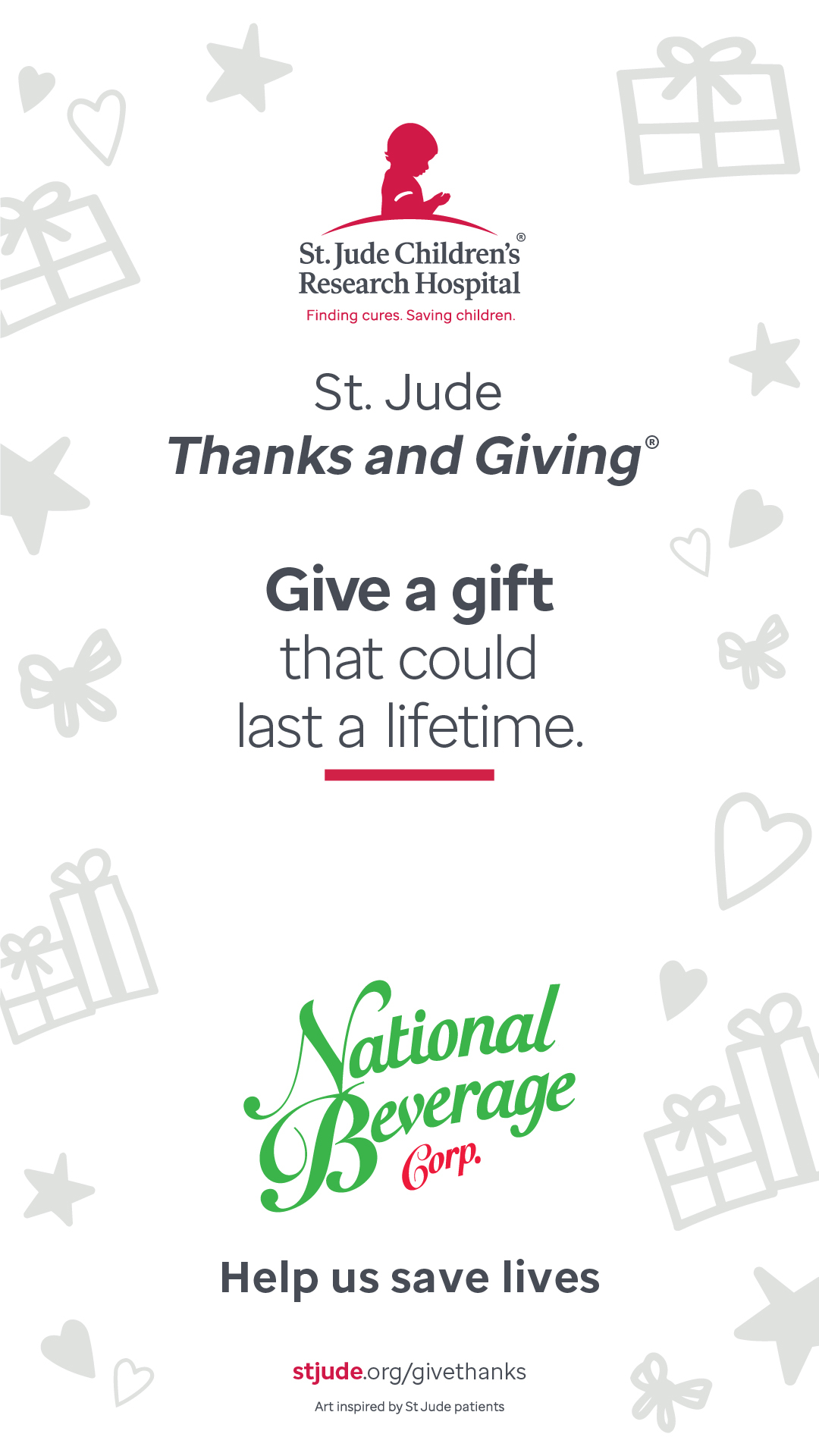 “What could be more meaningful than bringing hope and miracles to deserving children around the world! National Beverage pledges our unconditional support of these precious children and their grateful families. We implore all to join us in our treasured responsibility of giving a ‘chance at a lifetime’ to the children of St. Jude,” Caporella asserted.