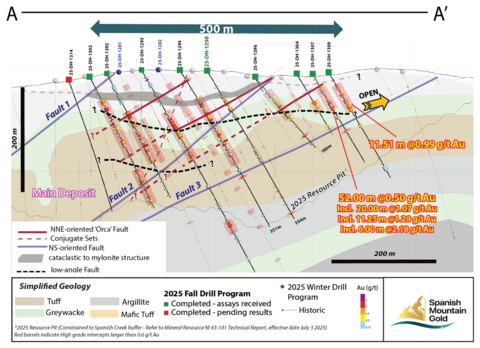 Spanish Mountain Gold Drilling Extends the Orca Fault Target Trend to a Strike Length Over 500 Metres Intersecting Numerous High-Grade Results Including 40.00 Metres Grading 0.98 g/t Gold