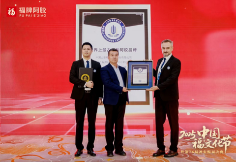 JINAN, China--(BUSINESS WIRE)--On the Winter Solstice of December 21, 2025, in Dong’e Town, Shandong — the recognized birthplace of Ejiao — the awarding of a world record was seamlessly woven into an ancient annual ceremony. Mr. Aurelian Constantin, Certification Officer of Lawrence World Records, took to the stage to officially announce that Fu Pai Ejiao was certified as the “World’s Oldest Ejiao Brand”, with a documented history traceable to 1691. He then jointly presented the official certificate with Mr. Li Haitao, President of Lawrence World Records China, to Mr. Yang Fu’an — inheritor of the National Intangible Cultural Heritage, Party Committee Secretary, and Chairman of Fu Jiao Group.