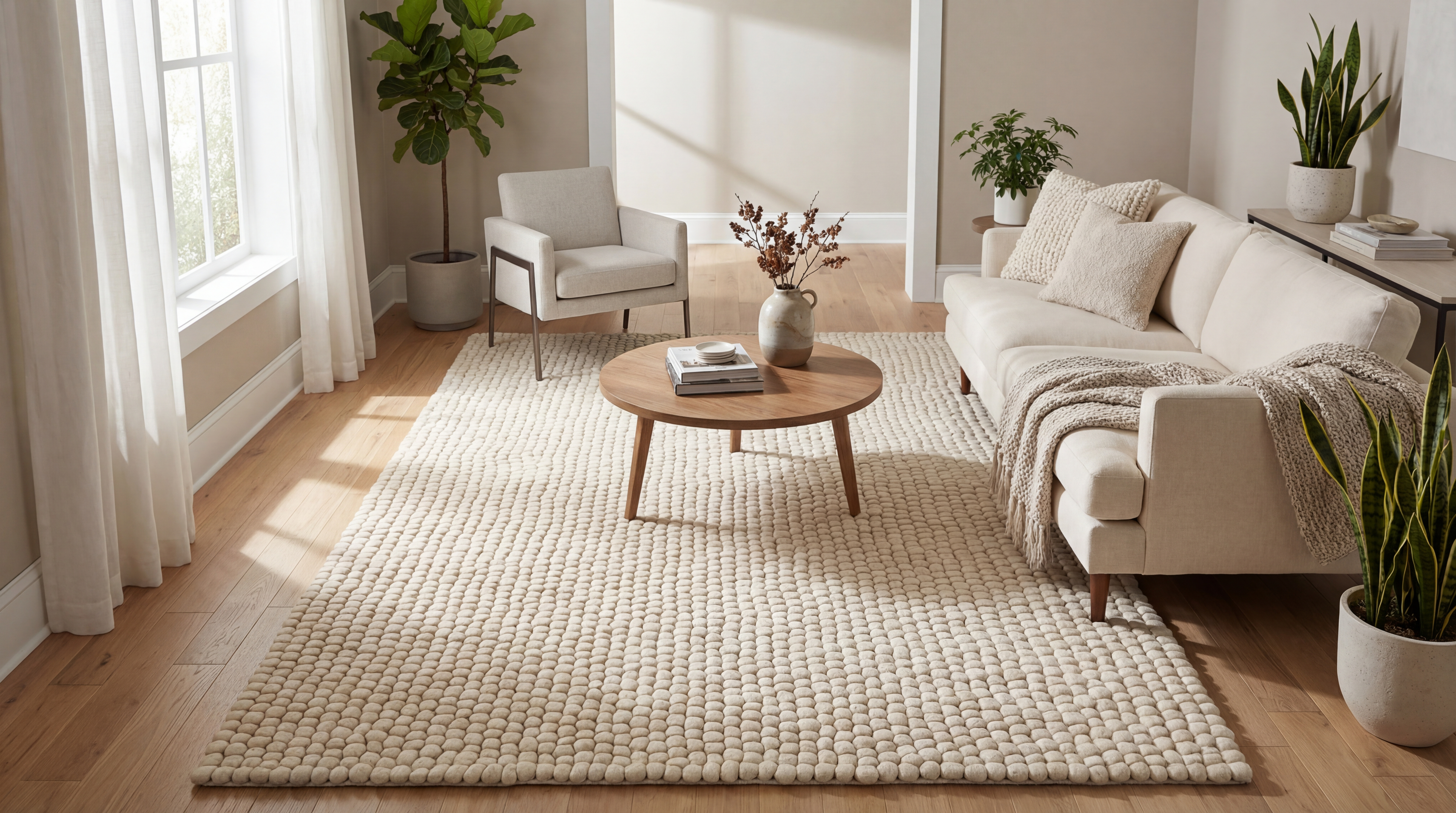 Minimalist Neutral Rugs: Soft neutral colors make the perfect versatile rug, complementing various interior styles, from modern to traditional. Opt for the Felt Ball Wool Rug or the Infiniity Shag Rug inspired by Cloud Dancer, Pantone’s 2026 Color of the Year, or choose from neutral shag, jute, wool, or cotton rugs for added texture or soft grays or beige tones, like the Atlas Wool Moroccan Wool Rug, for subtle warmth.