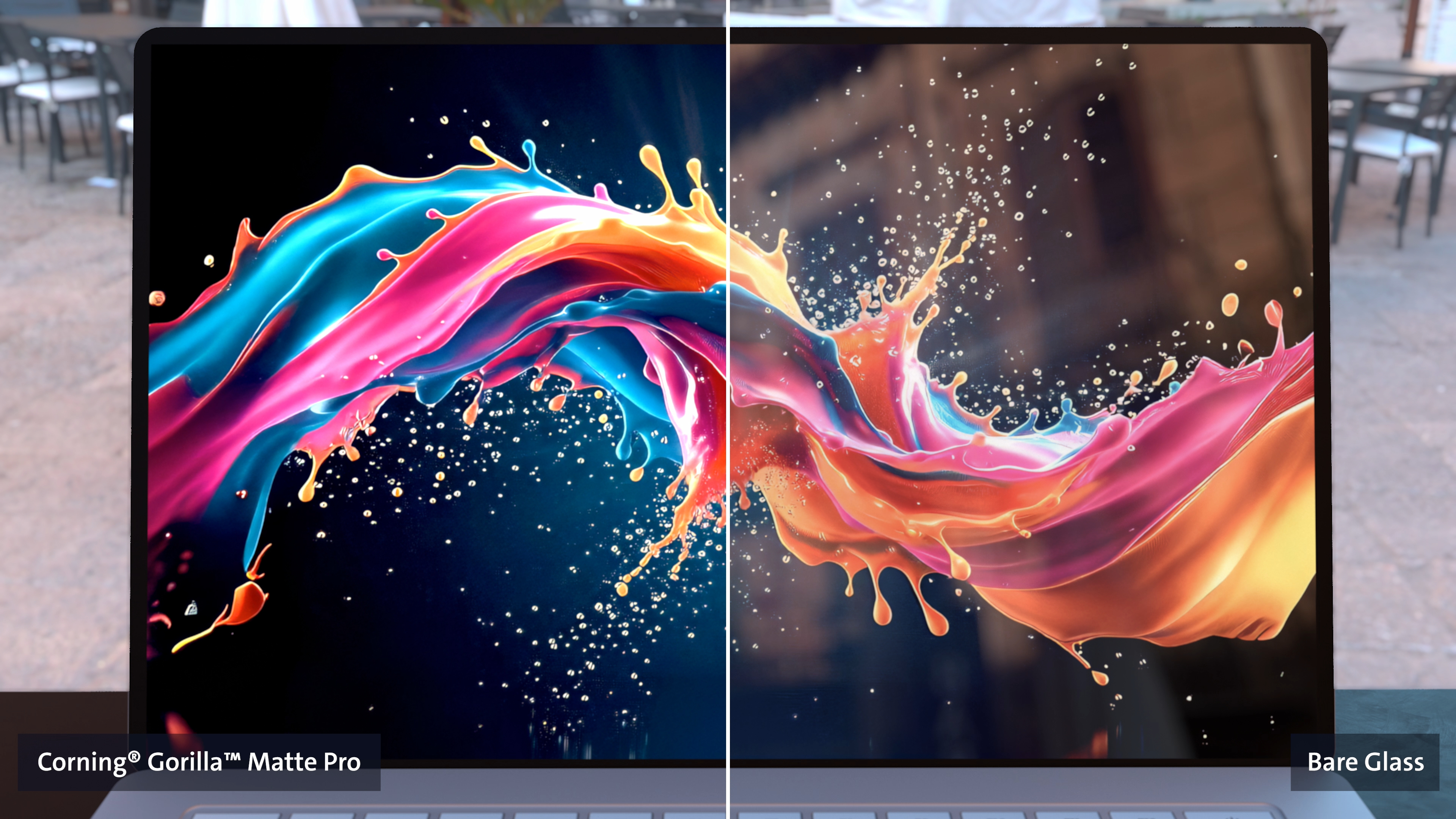 Corning’s Gorilla Matte Pro delivers next-generation performance for laptops and tablets, combining state-of-the-art anti-reflective and anti-glare technology with the renowned toughness of Corning® Gorilla® Glass. First featured on the Acer Swift Edge 14 AI laptop, this cover glass surface treatment improves the user experience on high-resolution displays in challenging lighting conditions by significantly reducing reflected light and distracting background reflections. The result is improved contrast, preserved image sharpness, and vibrant color accuracy.