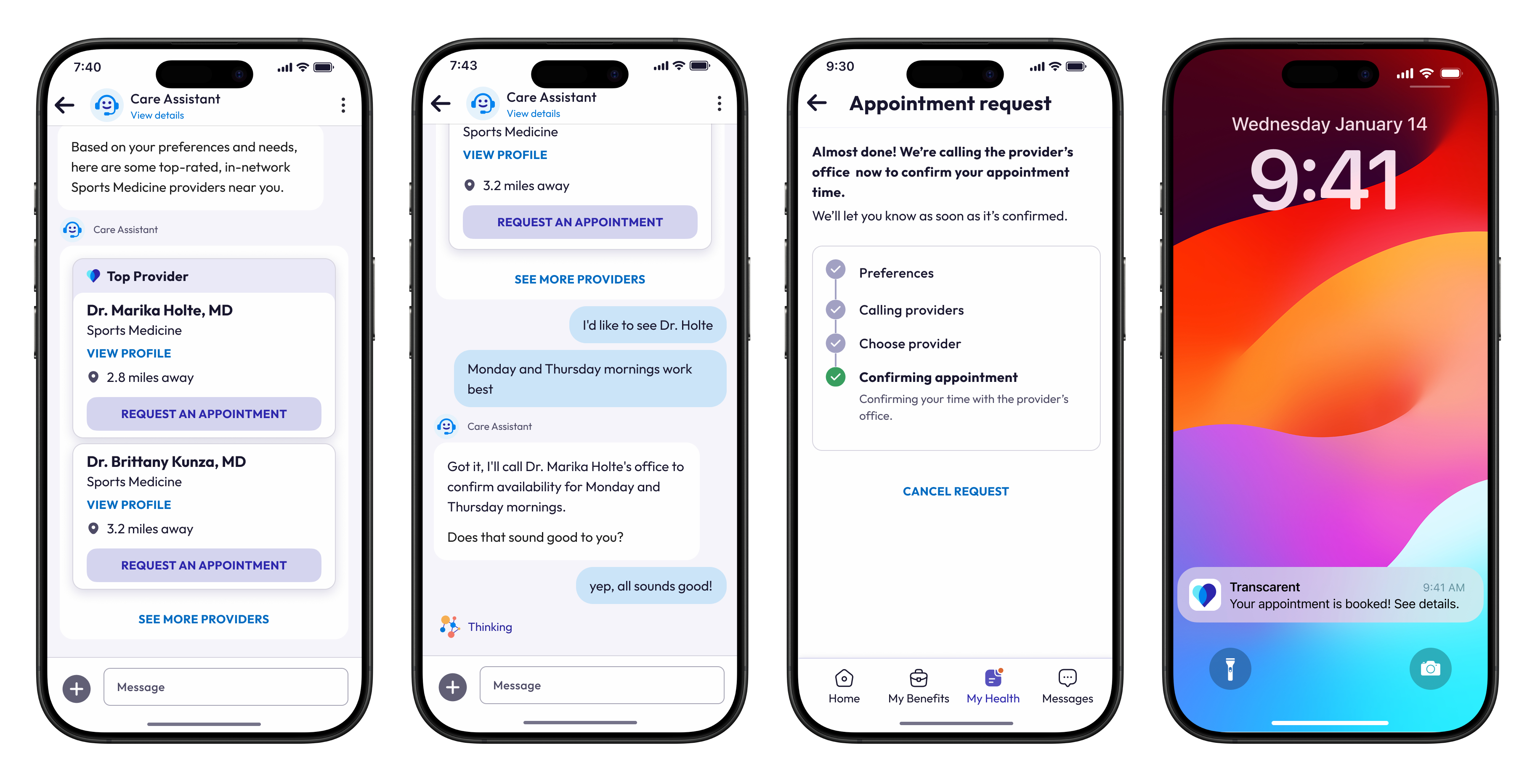 - Need to schedule a doctor’s visit? WayFinding’s AI agents handle end-to-end scheduling for virtual and in-person care. Options are selected for Members based on Transcarent’s provider quality data, in-network choices, and individual preferences such as preferred language and location.