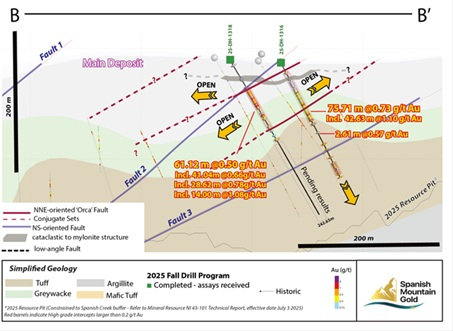 Five (5) additional drill holes were collared and successfully completed (see Figure 3) in the Orca Fault target area, 25-DH-1314 (Figure 1 and Table 1), 25-DH-1315 (Figure 1 and Table 2), 25-DH-1316 (Figure 2 and Table 3), 25-DH-1317 (Figure 1 and Table 4), and 25-DH-1318 (Figure 2 and Table 5). These drill holes continue to confirm and lend confidence to the extent of the Orca Fault target over 530 m strike length and its geological and structural interpretation within the constraining open pit for the MRE (see July 3, 2025 news release).