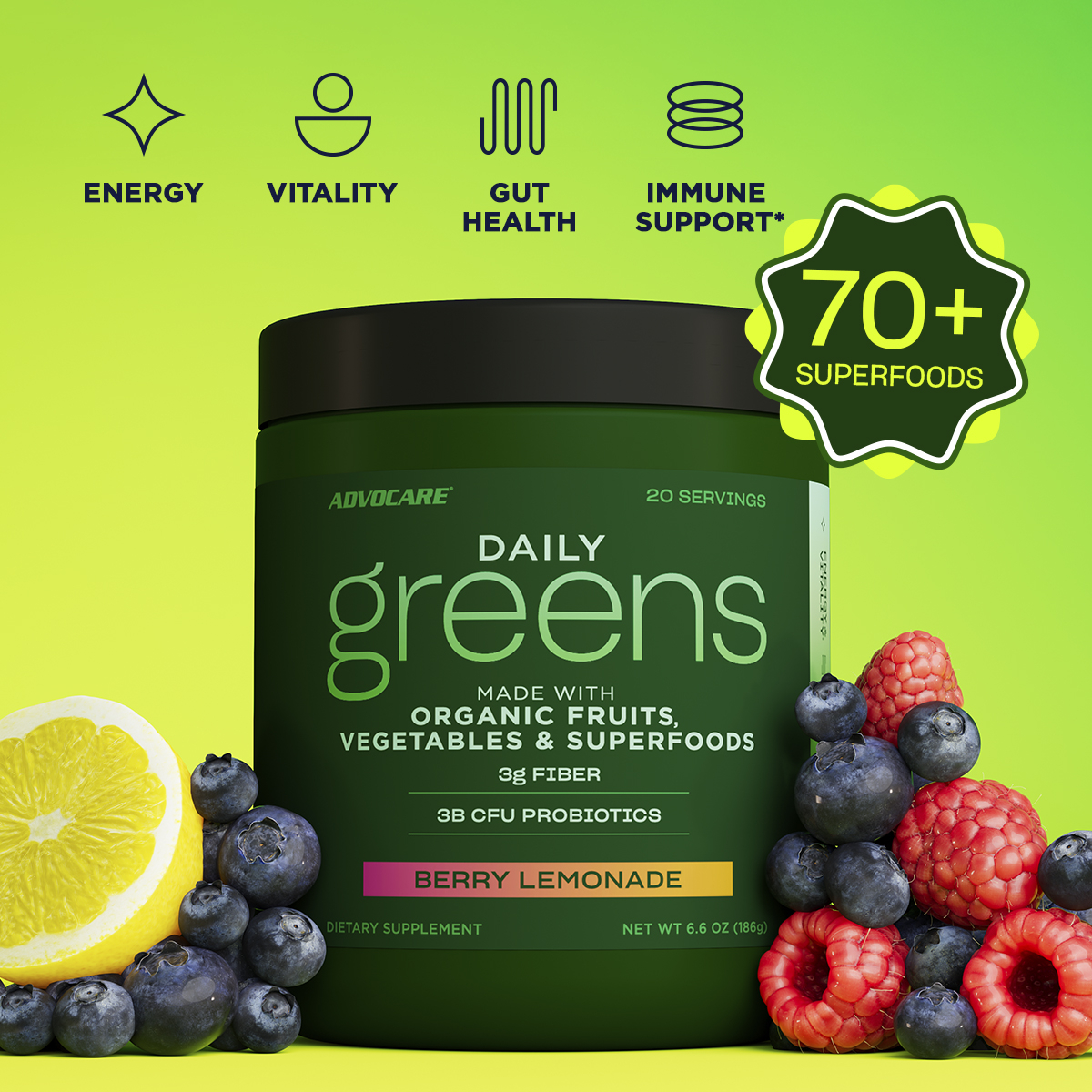 AdvoCare Daily Greens is crafted with a powerful blend of over 70 organic superfoods, antioxidants, digestive enzymes, prebiotics, and multivitamins that support energy, vitality, gut health, and immune system support.