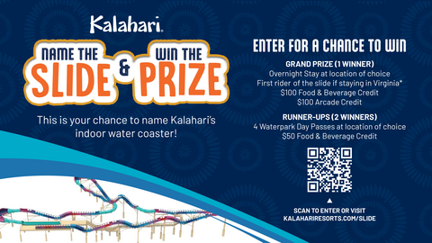 Beginning today, Jan. 12, guests can submit their most creative name idea at KalahariResorts.com/Slide, where the contest entry form is available. The featured attraction is a record-breaking ride described as the longest water coaster in North America, with launch speeds up to 20 feet per second, up to 60 seconds of ride time, and more than 10 powerful blasts featuring drops and gravity-defying lifts.