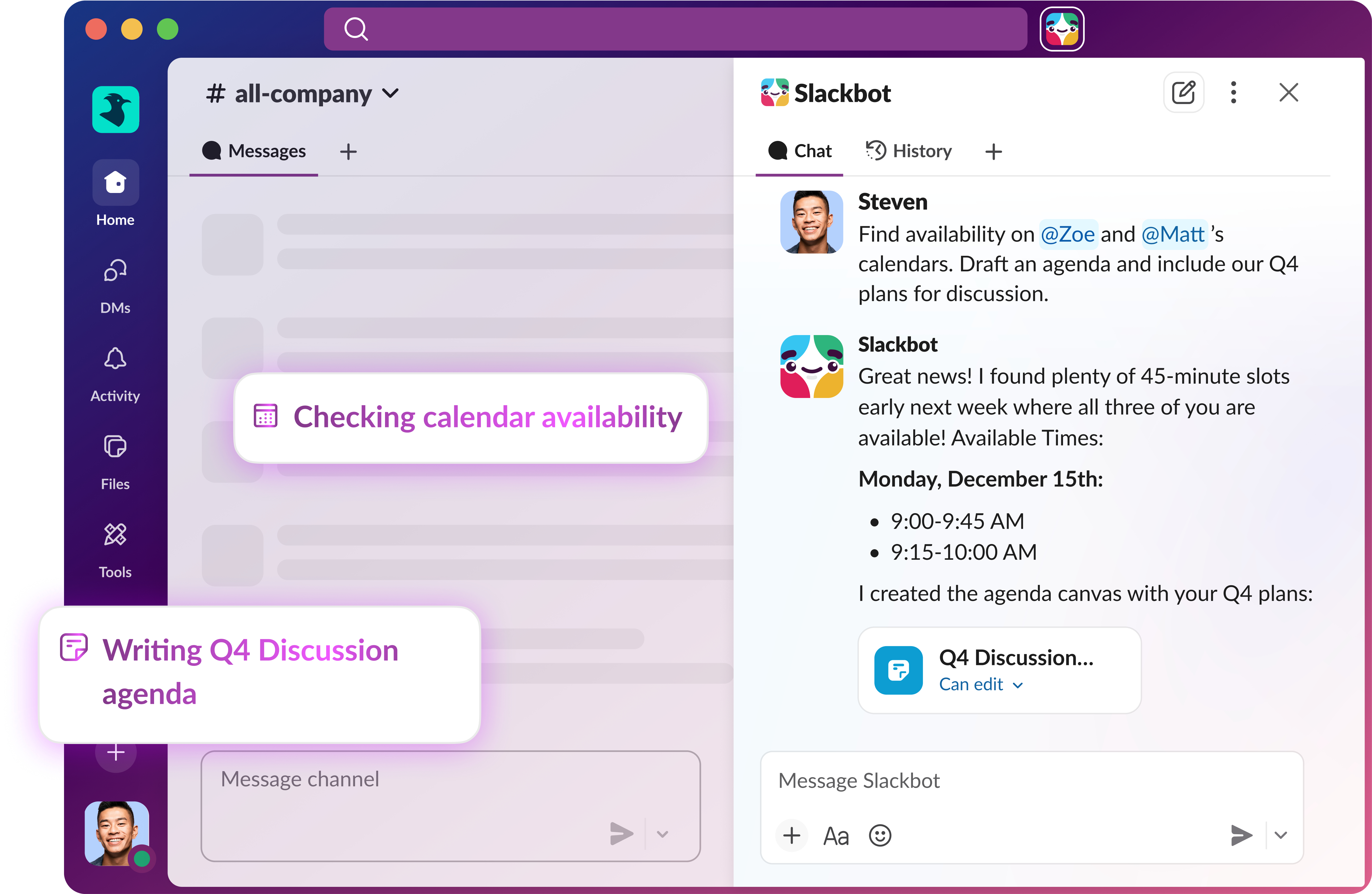 When it comes to managing your day, Slackbot knows you and your schedule. It helps you find time on calendars and schedule meetings, surface priorities, and set reminders so important work does not fall through the cracks. Instead of switching tools, you stay focused and keep momentum.