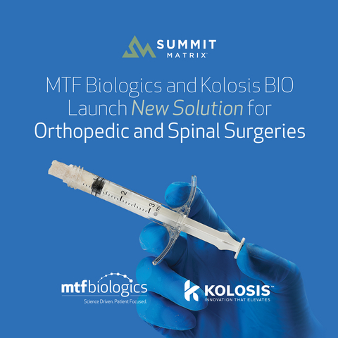 EDISON, N.J. & SALT LAKE CITY--(BUSINESS WIRE)--MTF Biologics, a global nonprofit organization that saves and heals lives by advancing tissue and organ donation, transplantation, and research, and Kolosis BIO (Kolosis), a premier provider of orthobiologic solutions, today announced the launch of Summit Matrix™, an advanced synthetic bone graft designed to improve bone regeneration after orthopedic and spinal surgeries. Powered by NanoLift™ surface technology, Summit Matrix combines nanoscale topography, biomimetic chemistry, and exceptional handling to enhance the surgeon experience.
