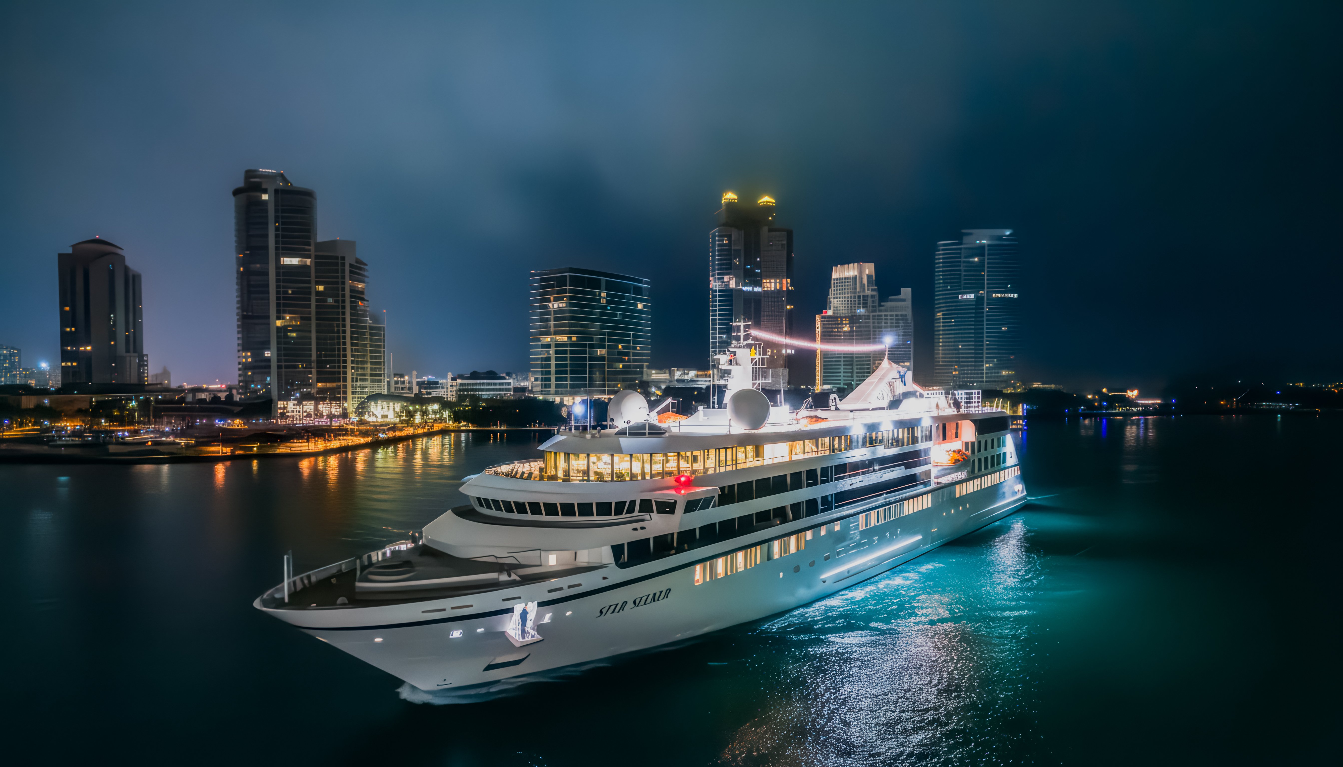 Star Seeker’s Captain Tom Schofield shared how meaningful it is to see a ship come alive once crew and guests come aboard and then introduced his senior officers and crew. Three current ship godmothers were notably present to welcome the new ship and godmother into the fold: Mrs. Louise Andren, godmother of Windstar’s first ship Wind Star and wife of founder Karl Andren; Mrs. Nancy Anschutz, godmother of Star Pride and wife of owner Phil Anschutz; Ms. Gloria Bohan, godmother of Star Legend, a travel industry leader. Pastor Bill White from Christ Journey Church provided a blessing for the ship before the evening concluded with a send-off firework show above the harbor.