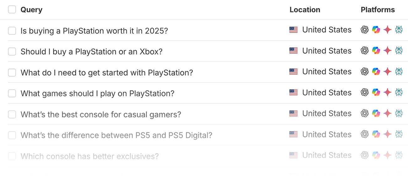 While Brand Radar’s native tracking focuses on prompts derived from popular, high-volume topics, giving teams broad coverage across AI-driven discovery, custom prompts let teams monitor the long tail: the specific, nuanced questions people ask when comparing options or looking for solutions. By tracking those exact questions across AI platforms, teams get a clearer view of real visibility without being misled by isolated responses.