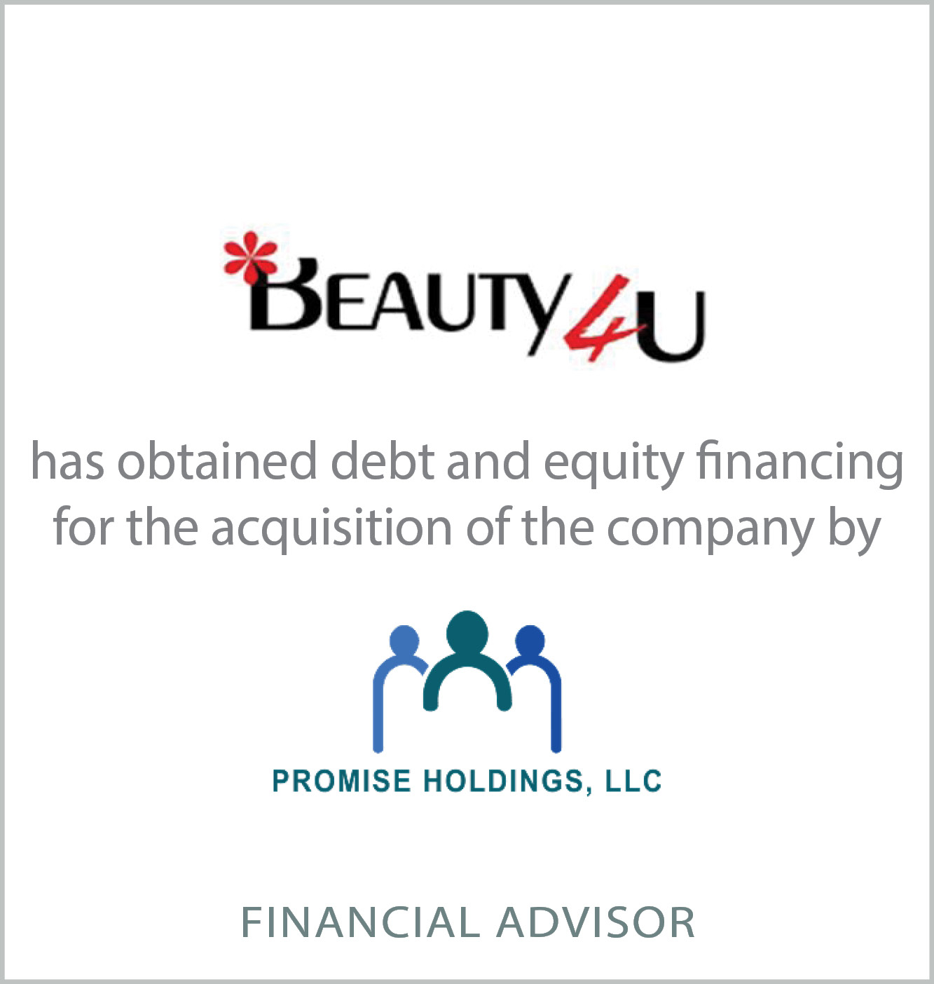 NEW YORK--(BUSINESS WIRE)--D.A. Davidson & Co. (“D.A. Davidson”) announced today that it served as exclusive financial advisor to Promise Holdings (“Promise”) for raising the debt and equity capital to support its acquisition of Beauty 4U (“Company”). D.A. Davidson successfully raised the financing from The Copia Group and Innovate Capital Growth Fund.