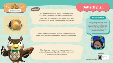 - Signage throughout the aquarium featuring Blathers and creature descriptions with information from the game.