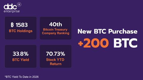 NEW YORK--(BUSINESS WIRE)--DDC Enterprise Limited (NYSEAMERICAN: DDC) (“DDC” or the “Company”), a global Asian food platform and digital asset treasury company, today announced the acquisition of an additional 200 Bitcoin (“BTC”) as part of its ongoing, structured Bitcoin treasury program. Following this transaction, DDC’s total Bitcoin holdings have increased to 1,583 BTC.