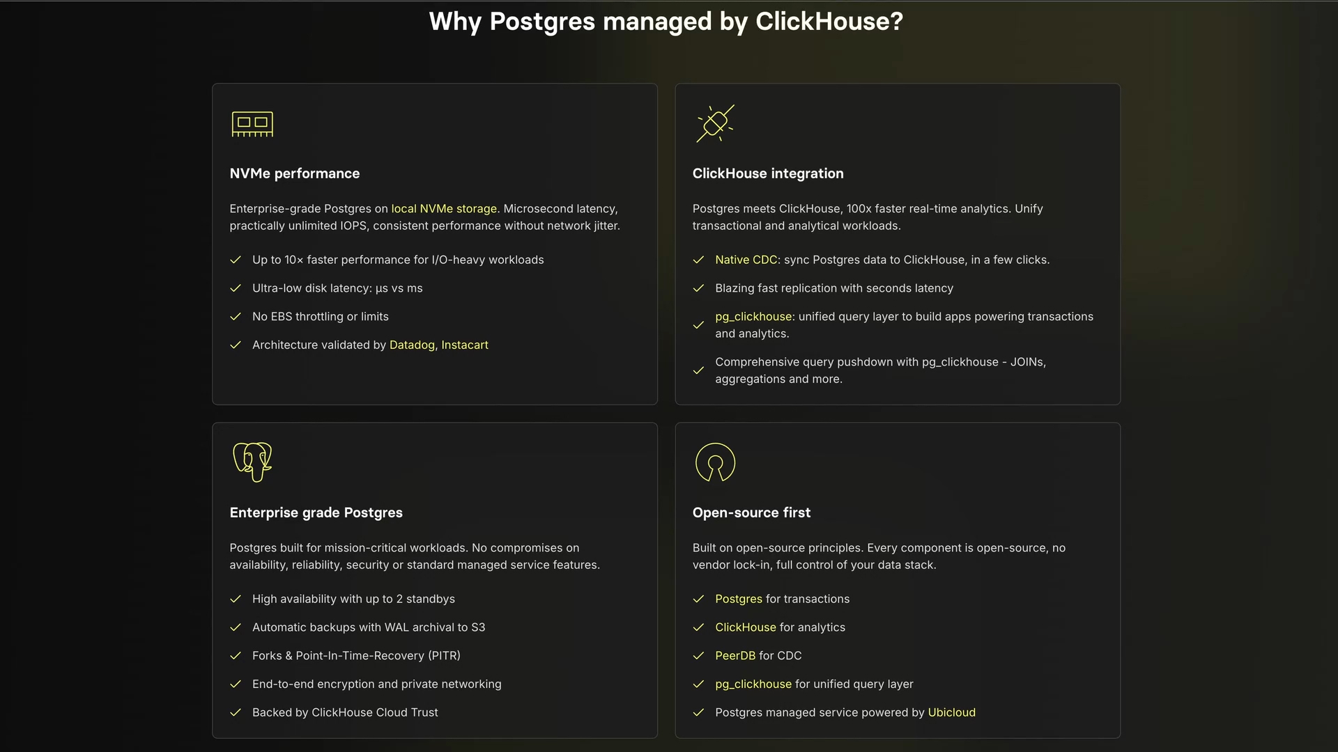 Deze aankondiging bouwt ook voort op de overname van PeerDB Inc. door ClickHouse in 2024. De technologie van dit Postgres-bedrijf die helpt bij de realtime gegevenssynchronisatie van Postgres naar ClickHouse voor honderden zakelijke klanten, bevestigt de natuurlijke synergie tussen Postgres en ClickHouse.