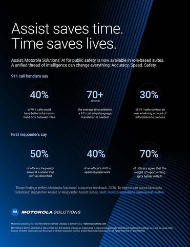 CHICAGO--(BUSINESS WIRE)--Motorola Solutions (NYSE: MSI) today announced the launch of Assist Suites, a portfolio of role-based AI for public safety solutions designed to deliver the right intelligence to the right person at the right time. Assist Suites synthesize multiple sources of data from across an agency - 911 audio, body and in-car camera footage, radio transcripts and more - into a unified thread of intelligence to help accelerate emergency response times, enhance safety and transparently support the highest levels of operational and reporting accuracy.
