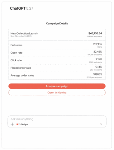 As the autonomous B2C CRM, Klaviyo has consistently pushed the industry forward with systems that turn raw data into adaptive, intelligent action. The Klaviyo app in ChatGPT continues that trajectory, bringing Klaviyo’s AI directly into the tools marketers use every day and creating a new channel for the future of connected, agentic commerce.
