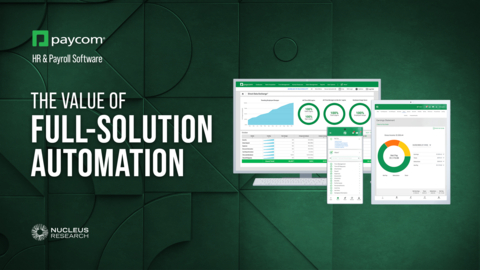OKLAHOMA CITY--(BUSINESS WIRE)--Paycom Software, Inc. (NYSE: PAYC) (“Paycom”), a leading provider of comprehensive, cloud-based human capital management software, today announced new findings from a Nucleus Research study highlighting the substantial value gained by organizations using Paycom’s full‑solution automation. Among the organizations interviewed, primary benefits included avoided costs and increased productivity stemming from greater data visibility, the retirement of old systems and increased automation.