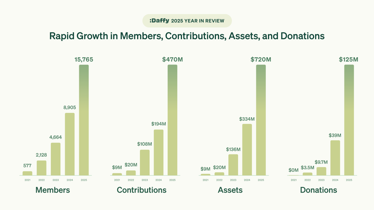 Private stock contributions also accelerated significantly. Through Daffy's Private Stock Donation Program and Daffy for Work, members contributed over $90 million in private company stock in 2025, expanding access to a form of giving historically limited to founders and senior executives.
