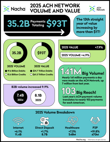 RESTON, Va.--(BUSINESS WIRE)--The ACH Network reached new highs in 2025 as both standard and Same Day ACH usage continued to grow, both in the number of payments and their value.