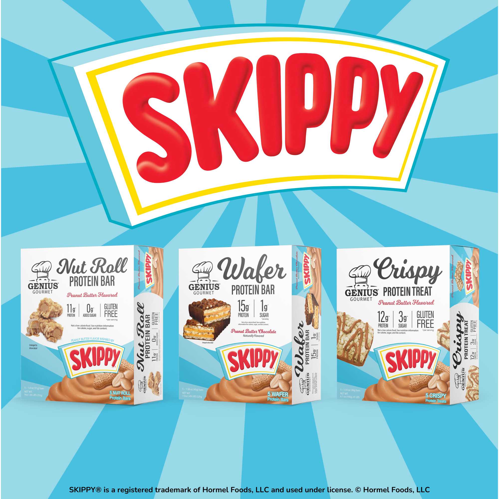- Genius Gourmet® SKIPPY® Crispy Protein Bar: a modern take on the classic crispy treat, made with SKIPPY® Natural Peanut Butter Spread and delivering 12 grams of protein (24% DV) with a craveable crunchy texture per serving.